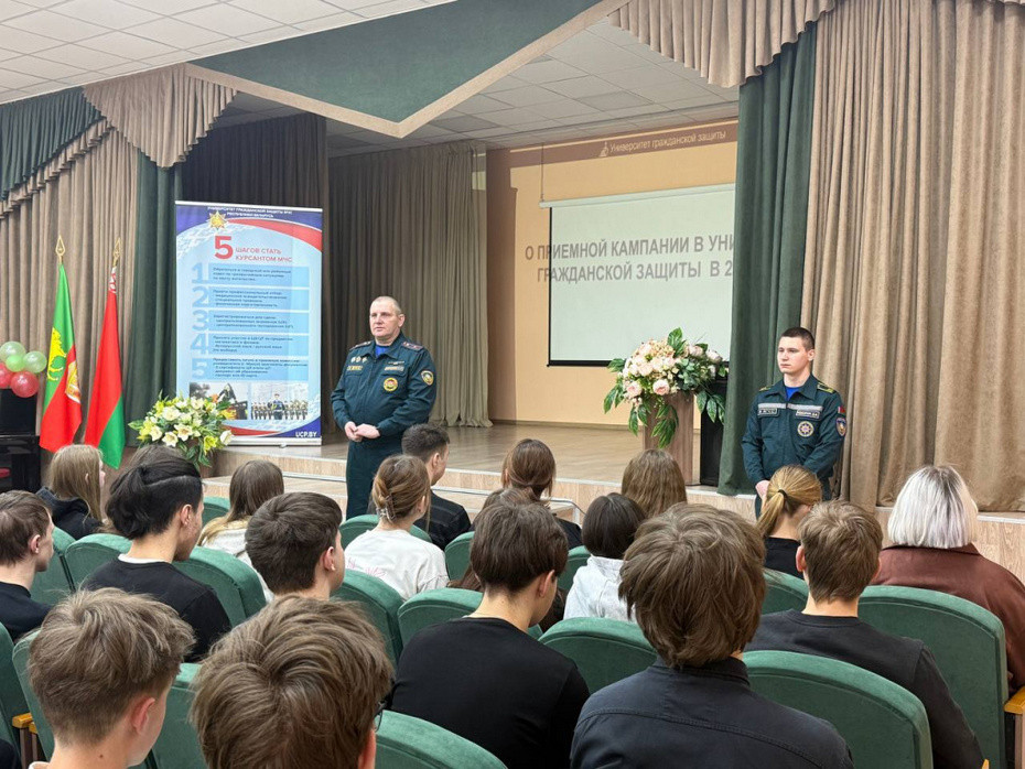 С чего начать свой путь в профессию спасателя школьникам рассказал курсант 4 курса высшего учебного заведения Министерства по чрезвычайным ситуациям Республики Беларусь – университета гражданской защиты Дмитрий Романчук. Будущий спасатель рассказал о деятельности университета, отметив, что учреждение образования располагает современной учебно-лабораторной базой, специализированными аудиториями, учебно-тренировочным манежем, спортивными залами, информационно-библиотечным центром и современным новым бассейном.