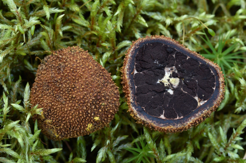 Элафомицес шиповатый – это подземный сумчатый гриб, который внешне напоминает трюфель, но относится к другому роду. Его плодовые тела имеют желтовато-серую или черновато-бурую поверхность с шиповидной или сильно зернистой текстурой. Также у гриба очень толстый и пестрый перидий (оболочка плодовых тел) и глеба (внутренняя часть гриба), которая изначально имеет вид белой ватообразной субстанции. По мере созревания внутренность гриба заполняется черновато-коричневым порошком, содержащим внутри огромное количество спор.