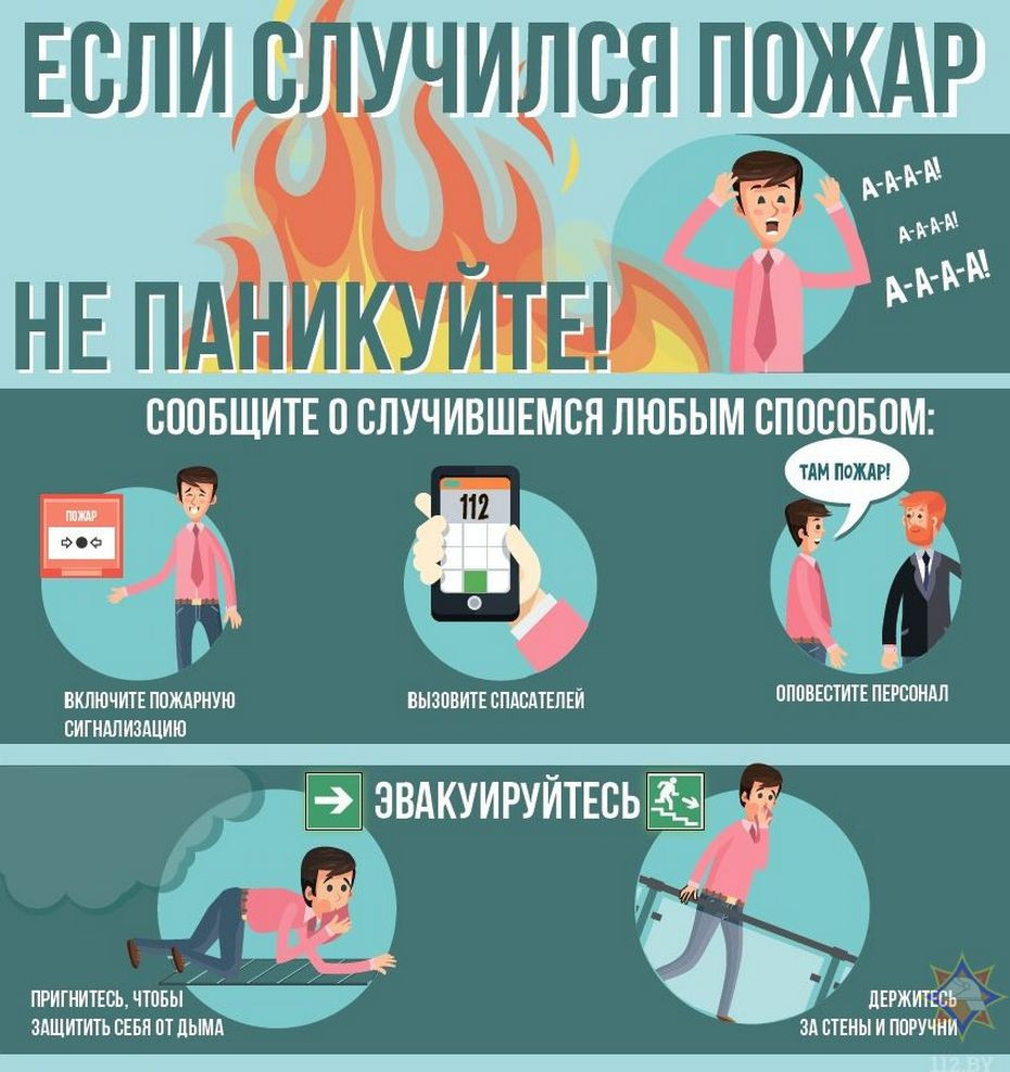коллег, позвоните по телефону 112, по возможности воспользуйтесь огнетушителем,