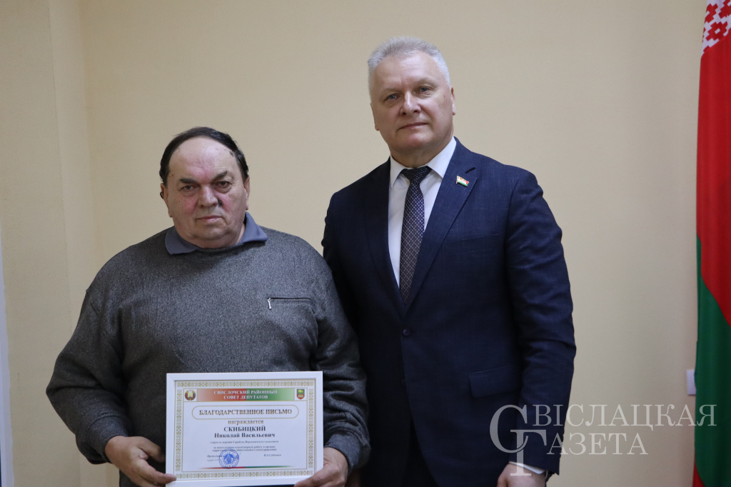 Сессия продолжилась чествованием партнеров и активных старост. За взаимодействие с органами местного управления и самоуправления Почетной грамоты Гродненского областного Совета депутатов удостоены директор ОАО «Акр-Агро» Евгений Дудак, Грамоты Свислочского районного Совета депутатов – директор ОАО «Хоневичи» Юрий Куличик.