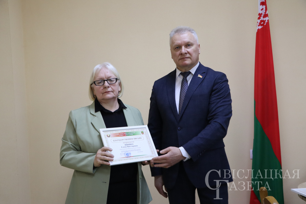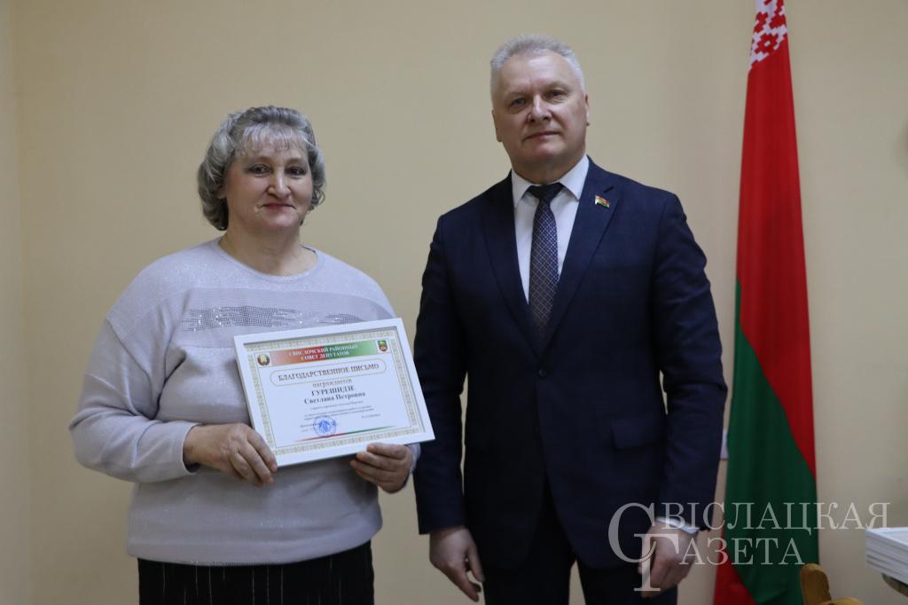 За плодотворную работу поощрены благодарственными письмами председателя Свислочского районного Совета депутатов старосты Светлана Гурешидзе (г.п. Порозово), Татьяна Казакевич (аг. Тиховоля), Николай Скибицкий (д. Скреблы), Оксана Сушко (аг. Хоневичи), Людмила Турок (д. Стоки), Елена Шишко (аг. Пацуи), Любовь Ярош (аг. Новый Двор).