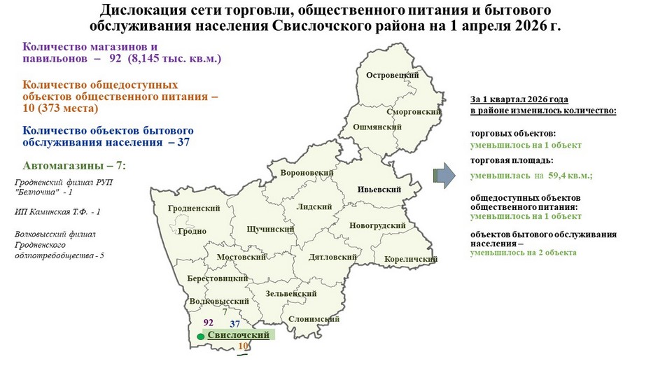 Дислокация сети торговли, общественного питания и бытового обслуживания населения Свислочского района на 1 апреля 2026 г.